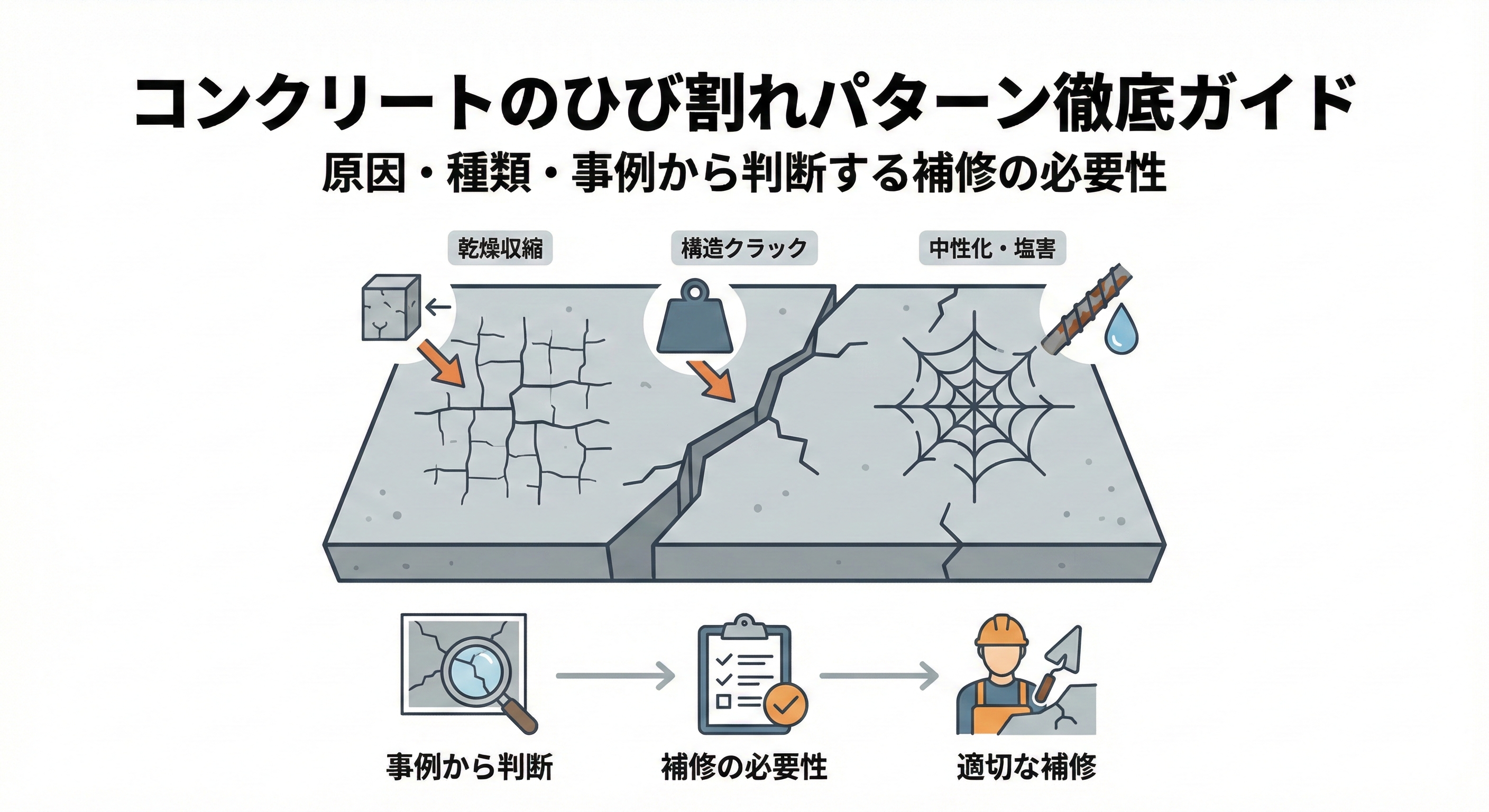 コンクリートのひび割れパターン徹底ガイド|原因・種類・事例から判断する補修の必要性