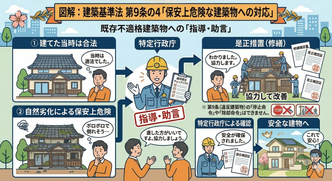また、違法ではないけれど古くなって危険な建物に対するルール(第9条の4)についても併せて解説します。不動産トラブルや空き家問題に関わる、非常に重要な内容です。