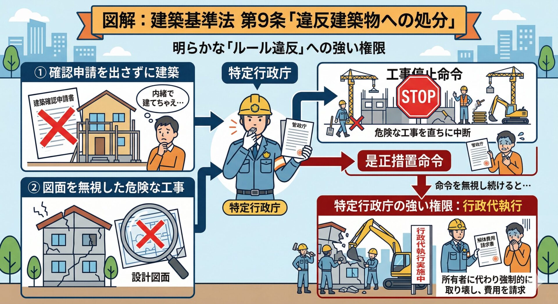 ※第9条の「命令」の対象者は、建物の所有者だけでなく、「工事を請け負った建設業者(下請け含む)」や「設計者」にも及びます。プロが違法工事に加担した場合、免許取消などの重い行政処分(第9条の3)が下されます。