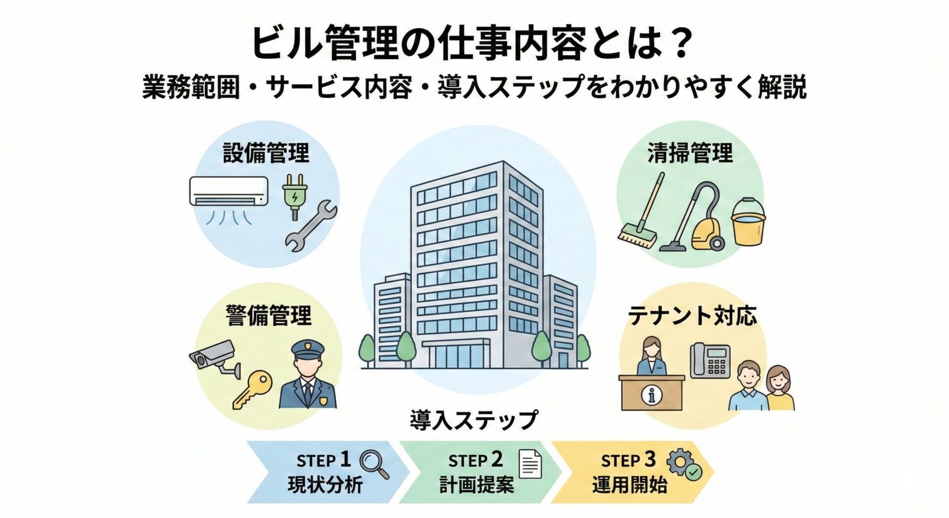 ビル管理は、建物の価値と入居者の安心を守るための「運用の設計図」です。仕事内容は清掃や点検だけでなく、法定点検(法律で定められた検査)やテナント対応まで幅広く、任せ方次第でコストもトラブルも大きく変わります。