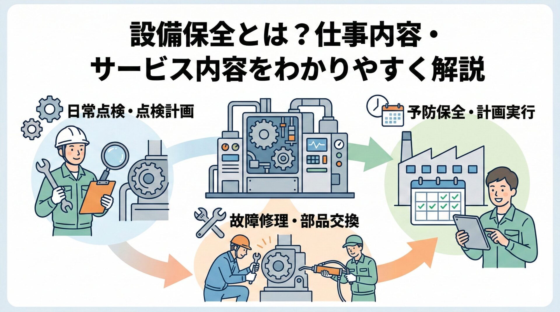 まず押さえたいのは、設備保全は「修理」だけではない点です。故障対応に加えて、故障を起こさない仕組みづくりまで含めて設計すると、現場の負荷と停止リスクが一気に下がります。