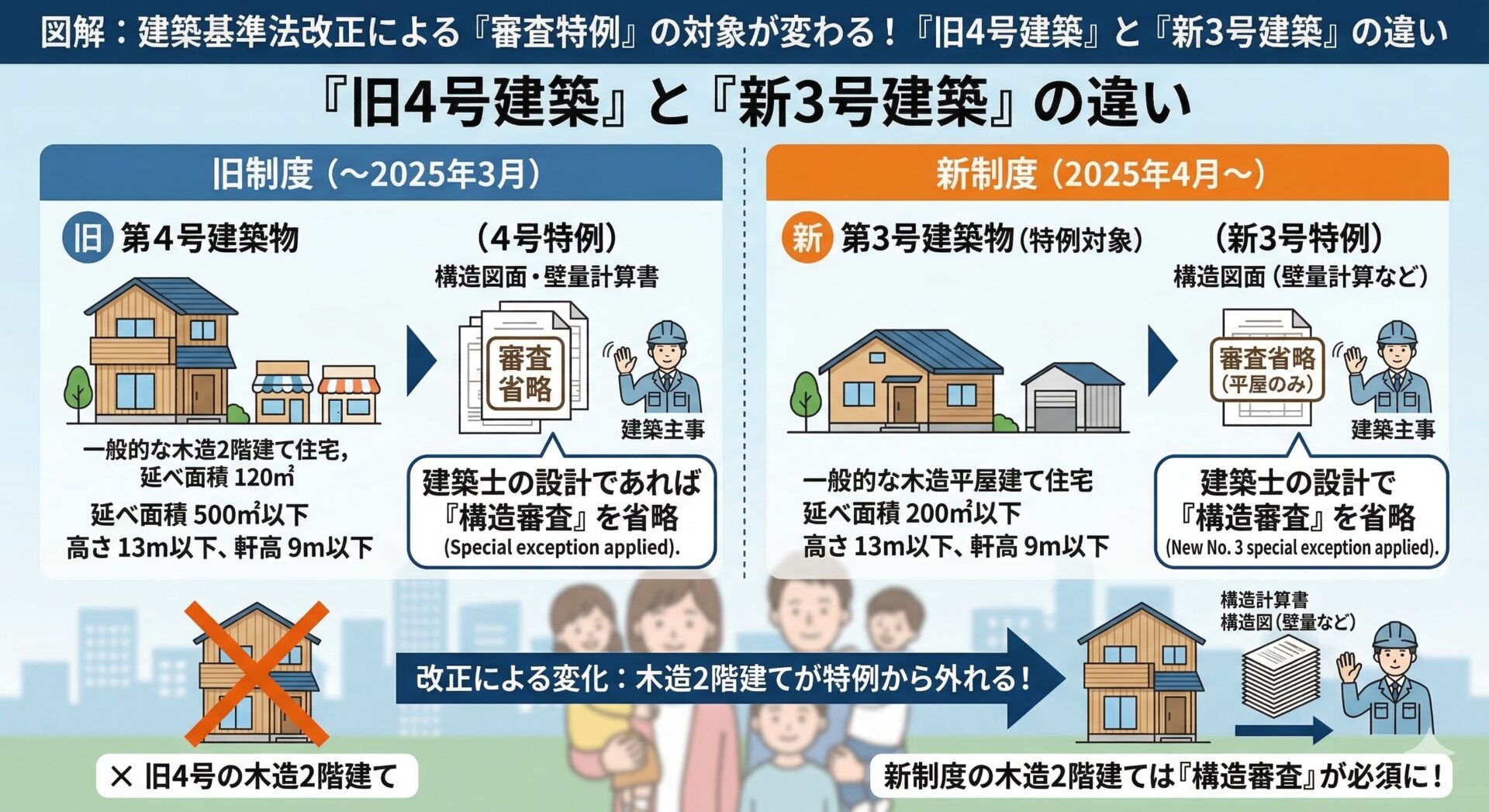 - 2025年の法改正で木造2階建ては特例から除外された。